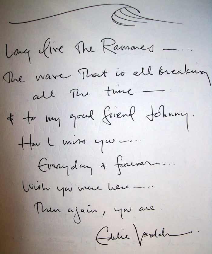 Eddie Vedder's handwritten note in the RAMONES MUSEUM guest book, July 2012.